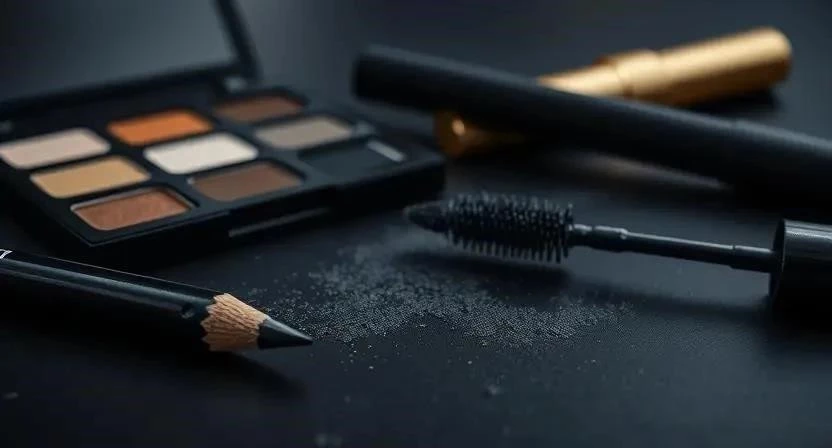 - Тени для век: палетка с темными матовыми оттенками (черный, серый, коричневый).