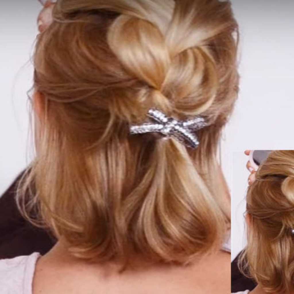 - Расправьте половинки бантика, сбрызните его лаком, зафиксируйте невидимкой;